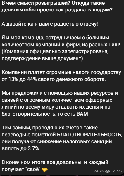 Среди множества мотивационных постов на тему того, что начать зарабатывать легко без соответствующего образования и опыта, встречается запись о бизнесе. Команда Дианы сотрудничает с компаниями, которые платят большие налоги государству – до 44% от оборота. Команда тг-канала DianaPodarit предложила им свои ресурсы и связи по офшорным линиям по всему миру для запуска благотворительных кампаний, что и помогает снизить налоговые вычеты в разы.