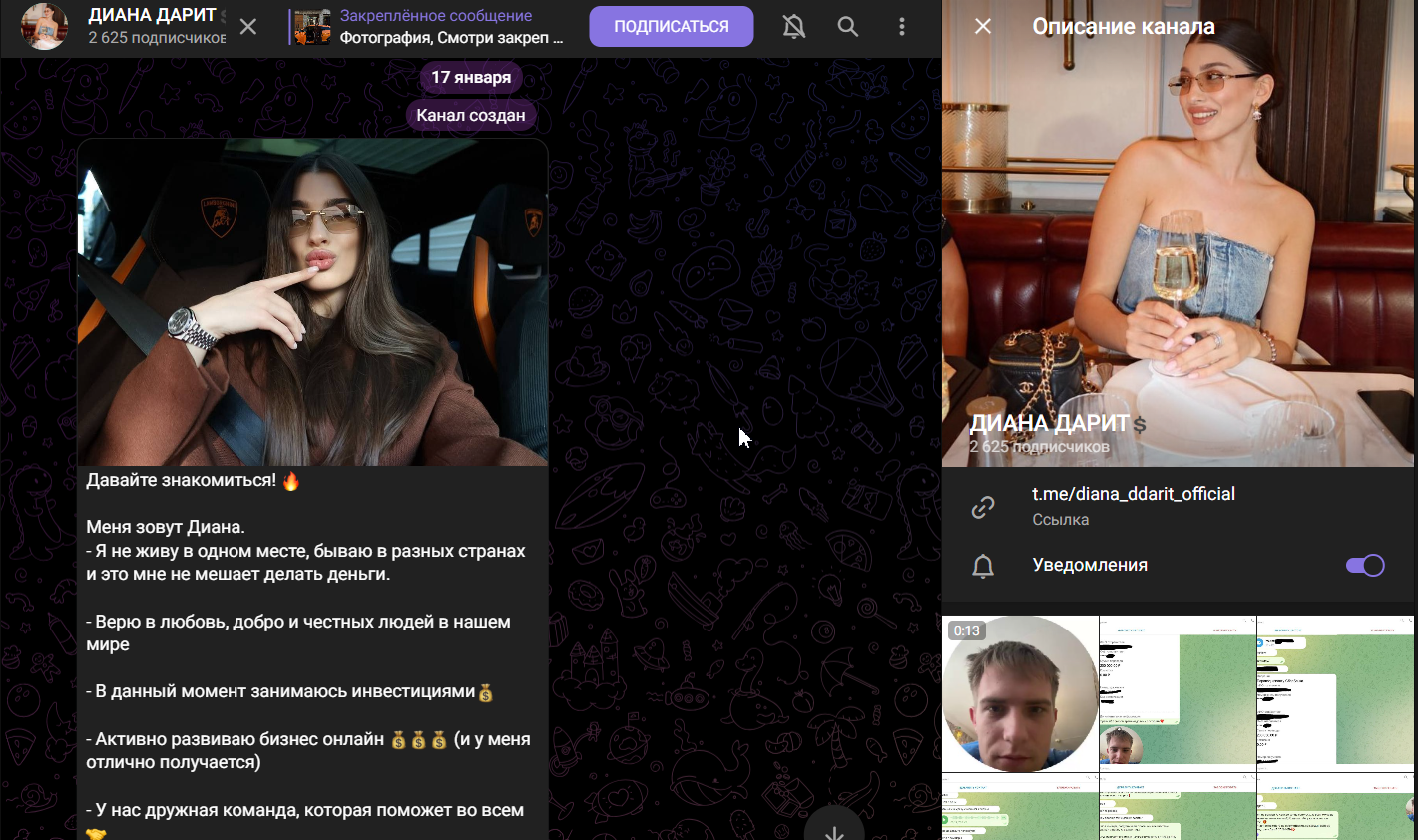 Тг-канал был зарегистрирован в январе 2025 года. Админ «Диана Дарит» оставляет в Телеграм приветственное сообщение, из которого следует, что Диана занимается инвестициями, но в каком именно направлении и сколько конкретно она зарабатывает – не сообщается. Автор обещает делиться своими знаниями в сфере финансов и устраивать конкурсы по бесплатной раздаче настоящих денег.