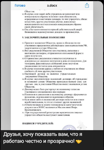 Из следующих постов следует, что Диана успешно ведёт собственный бизнес не в одиночку, а вместе с командой. Мало того, стартап работает законно и легально, на основании лицензии. Диана заявляет, что предоставляет полную отчётность перед уполномоченным органами и прикрепляет часть документа о регистрации ООО, только с замазанными реквизитами – это заставляет подозревать развод на тг-канале «Диана дарит», ведь документ может принадлежать кому угодно. Оригинал Диана обещает отправить только победителям вместе с денежным призом с личной банковской карты. Параллельно админ преследует цель привлечь к проекту 1 000 000 подписчиков.