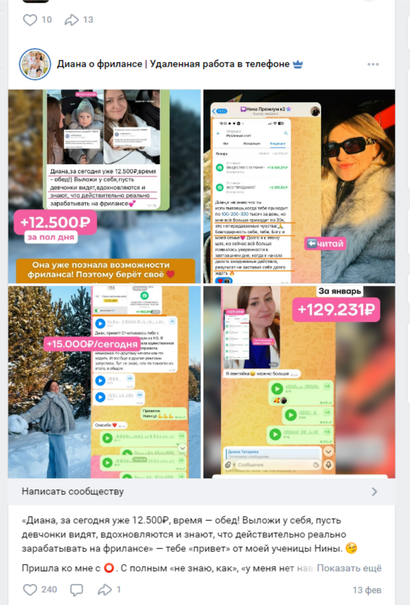 В своем блоге автор «Диана Тагирова Фриланс» @ dianayyakieva постоянно выкладывает кейсы и отзывы своих учеников. Скорее всего, больше половины из этого – фотошоп, и лишь немного – правда. Только зарабатывают эти девушки так же как и Диана, продавая доступ к чату и прочим учебным материалам.