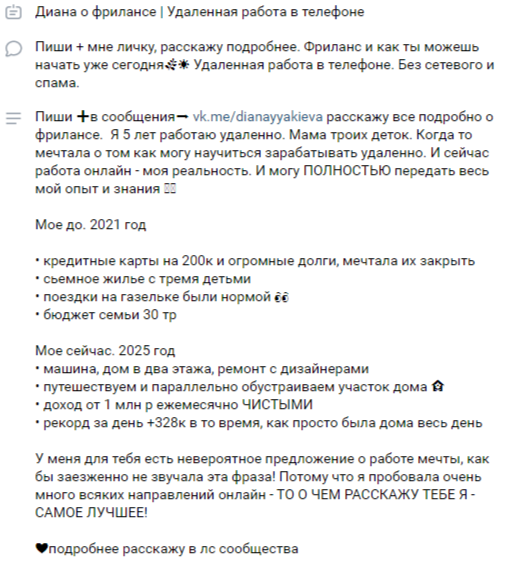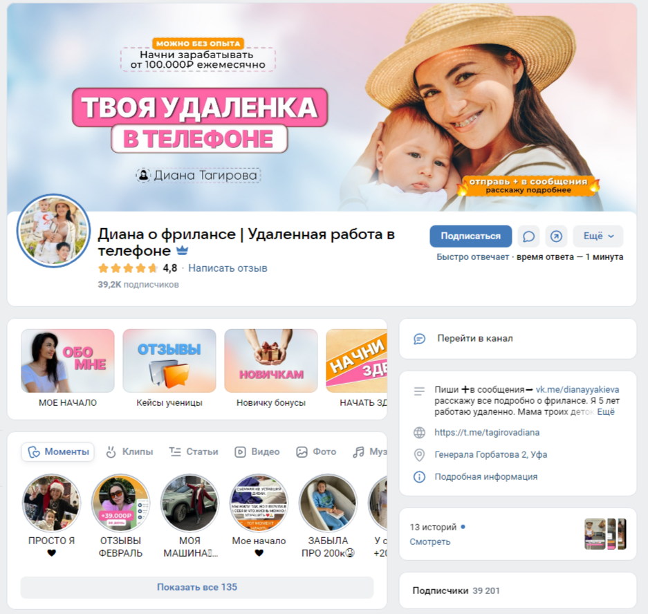 По итогам нашего расследования мы пришли к выводу, что не можем рекомендовать сотрудничать с вк-проектом «Диана Тагирова Фриланс». Автор ведет сомнительную деятельность, обещая высокий доход за несколько часов в день на удаленной работе. Настоящих доказательств этому нет, так как все отзывы Тагирова Диана Фаритовна публикует сама.