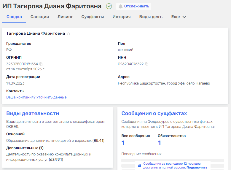 Мы выяснили, что девушка с 14 сентября 2023 года оформлена как ИП Тагирова Диана Фаритовна. Ее основной вид деятельности связан с дополнительным образованием детей и взрослых, а второй – с оказанием консультационных и информационных услуг. Это соответствует тому, что она транслирует в соцсети.