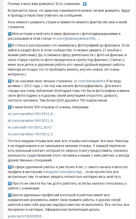 По всем подробностям она предлагает писать ей в личку. В открытую она ни условия сотрудничества, ни стоимость обучения не афиширует. Отсутствие прозрачности в этом плане настораживает. Диана Тагиров проводит периодически рассылку в ВК, но переходить по присланным ссылкам стоит осторожно, чтобы не попасться на развод от мошенников.