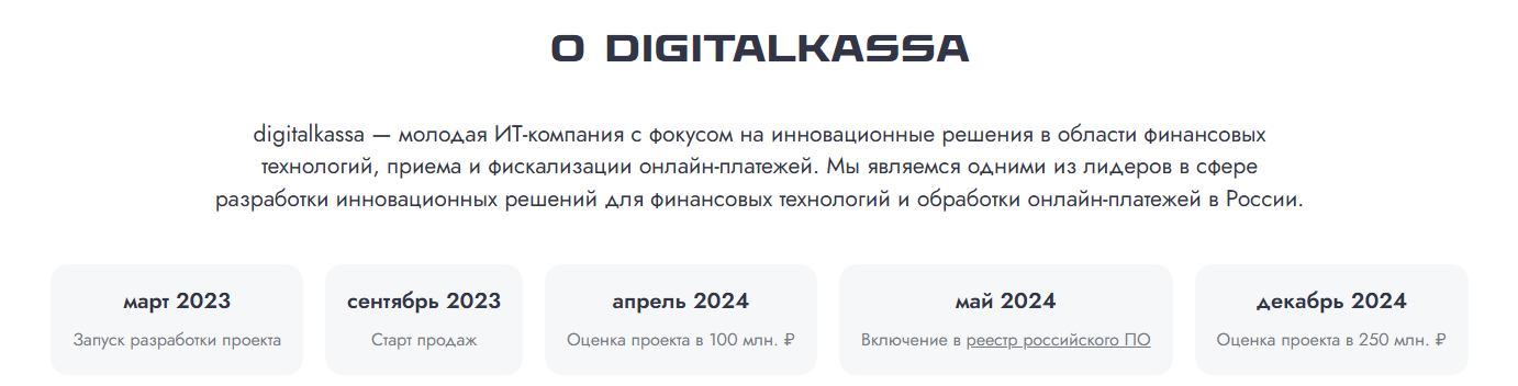 Проект DigitalKassa, по данным официального сайта, был запущен в 2023 году. В мае 2024 года был включен в реестр российского ПО.