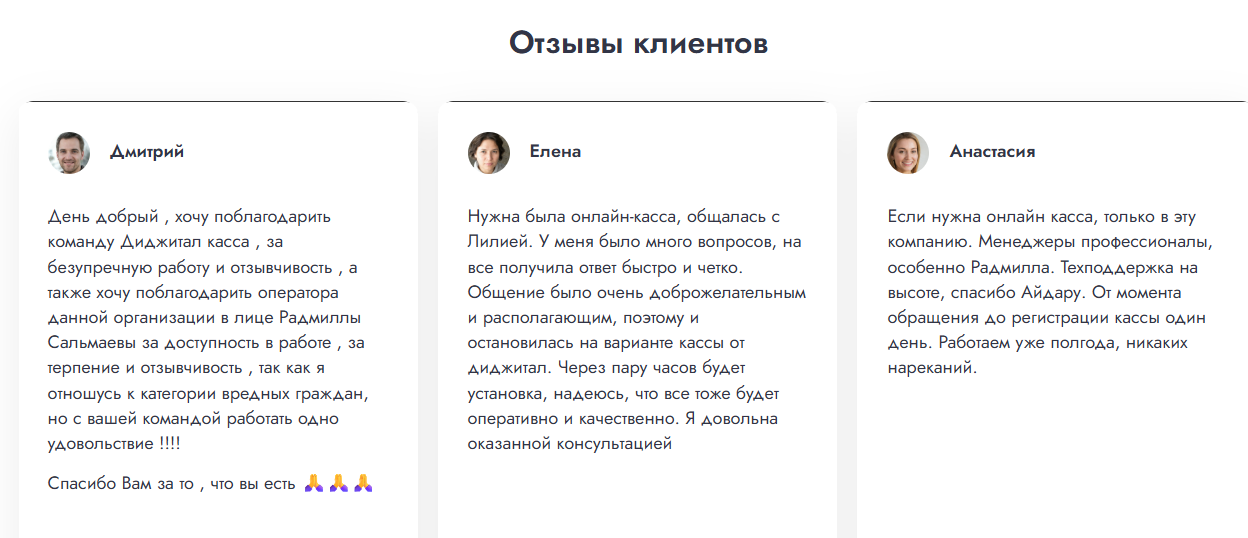 На digital kassa ru выложены отзывы клиентов. Пользователи отмечают хорошую работу программы, отзывчивость техподдержки, быстрое подключение сервиса. Указаны авторы отзывов, есть аватарки, но нет ссылок на профили в соцсетях. Поэтому сложно сказать, это реальные отзывы или фейки.