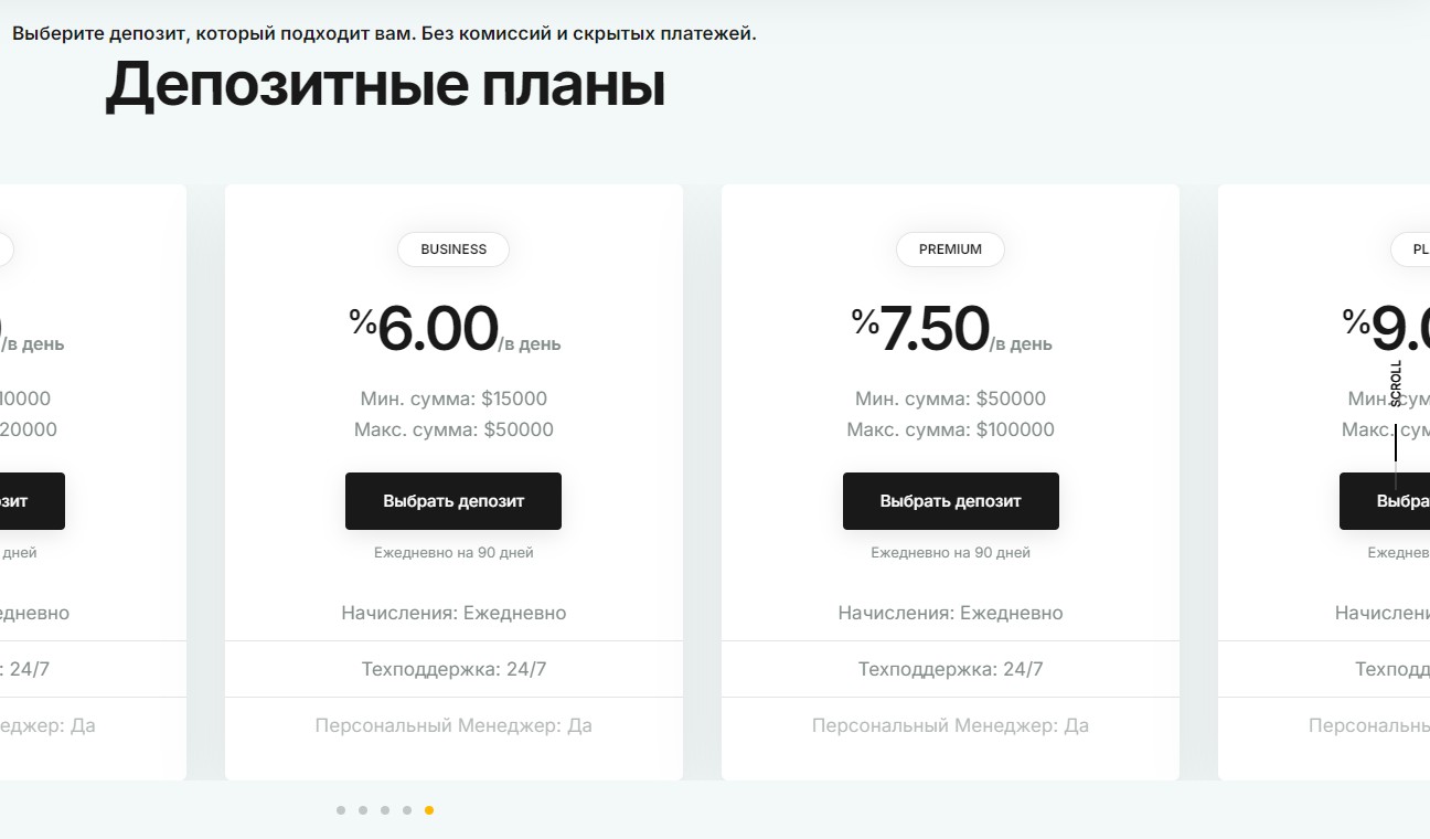 Для ознакомления с проектом доступны инвестиционные планы, но просмотреть их до конца не удается – виджет скроллинга заедает и последний тарифный план обрывается на середине.