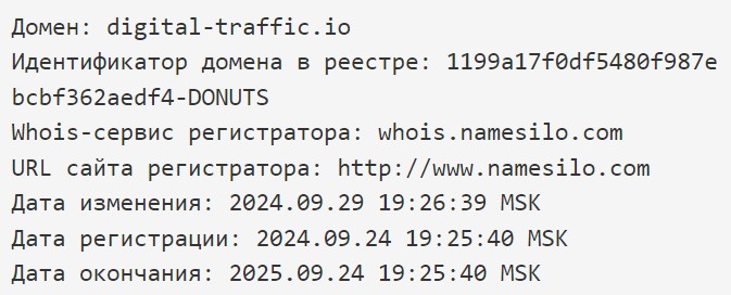 Официальный сайт компании digital-traffic io доступен на английском и русском языках. Домен зарегистрирован 3 месяца назад – 24 сентября 2024 года. При этом домен на данный момент находится в статусе «свободный».