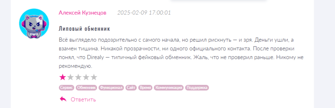 На крупных сервисах с обзорами деятельности различных обменников отзывы о Direaly com в основном негативные. Пользователи жалуются на то, что после создания заявки на обмен и отправления денег никакого ответа от команды обменника не поступает.