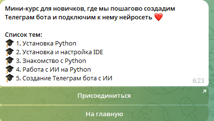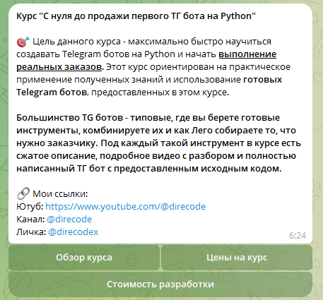 Курсы Direcode продает, как ни странно, через бота. Пользователям доступны 3 платных и несколько бесплатных курсов. Бесплатные курсы – это просто обучение установке Python, базовым навыкам работы с ним: