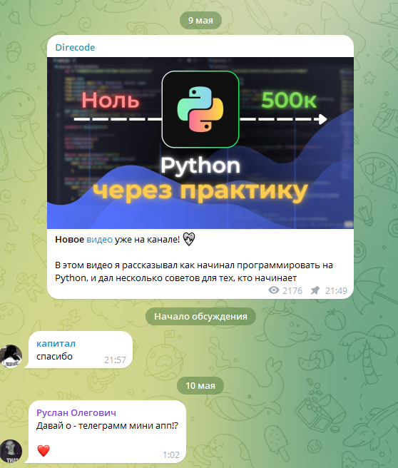 Основная деятельность автора, продажа курсов ведется через Телеграм-кана Direcode. На нем 2,5 тысячи пользователей с высокой активностью. Более половины пользователей смотрят посты. Под публикациями достаточно много реакций и комментариев.