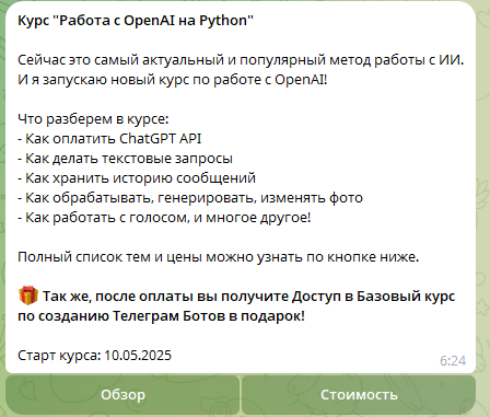 Курс по OpenAI доступен только в групповом или персональном формате. Стоимость – аналогичная предыдущему курсу.