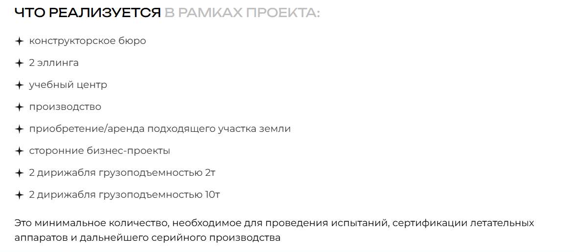 Инвестиционная платформа собирается реализовать конструкторское бюро, построить 2 эллинга, учебный центр, открыть производство, приобрести под это все большой участок земли, заниматься сторонними бизнес-проектами. В итоге за 3-5 лет с привлечением достаточного капитала будут построены 2 дирижабля грузоподъемность 2т и еще 2, которые смогут поднять в воздух до 10т. Для реализации нужен капитал от 100 млн долларов, поэтому компания продает доли пакетами.