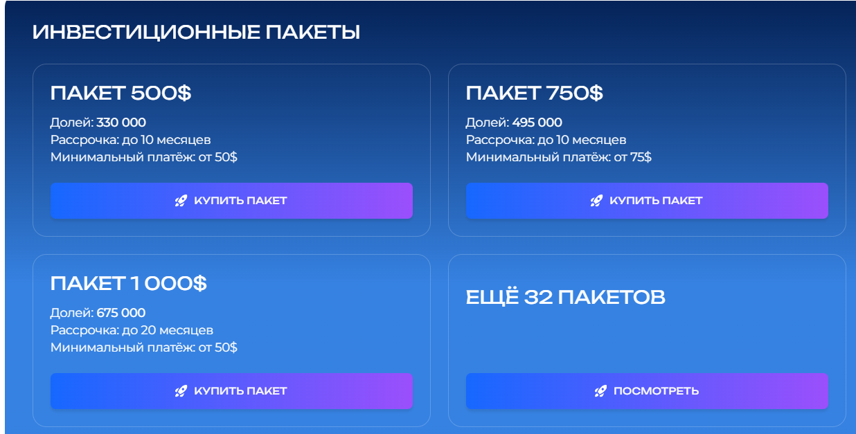 • Пакет 500 долларов — 330 000 долей, минимальная инвестиция от 50 баксов при рассрочке на 10 месяцев, при полной оплате доли начисляют сразу.