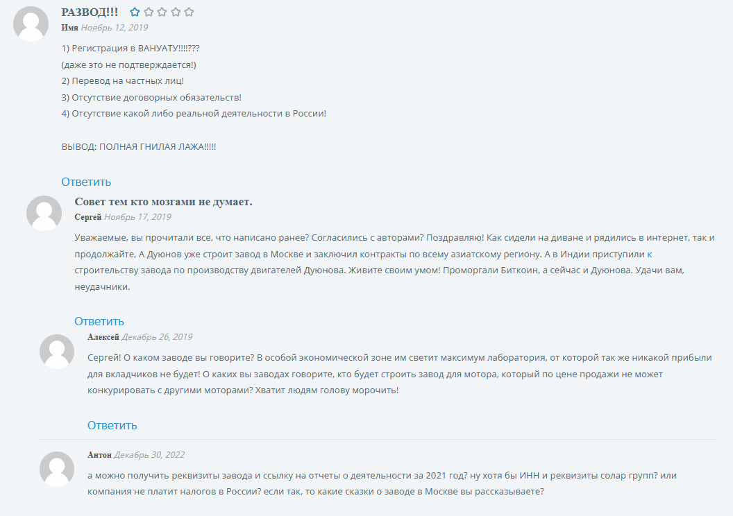 Дмитрий Дуюнов, основатель проекта, является конструктором. Трудился в ООО НТК Энергокомплекс, организация уже ликвидирована. Является учредителем двух организаций: ООО АС и ПП имеет выручку 13 млн за 2023 года и 5 арбитражных дел на сумму свыше 5 млн рублей, ООО Электротера с выручкой 120 тысяч в год имеет одно судебное производство по долгам. С 2017 года развивает компанию Solargroup, зарегистрированную на Коморских островах. Есть офис в Москве и контактный номер телефона, однако в России фирма действует нелегально. По заявлениям на сайте, открыто уже более 30 представительств по всему миру, посещаемость платформы превышает 160 тысяч человек в месяц.
