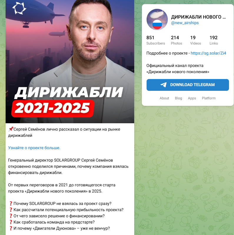 • Телеграмм канал Дирижабли Нового Поколения — подписано около 850 человек. В new airships регулярно выходят видео обзоры проекта с привлечением экспертов.