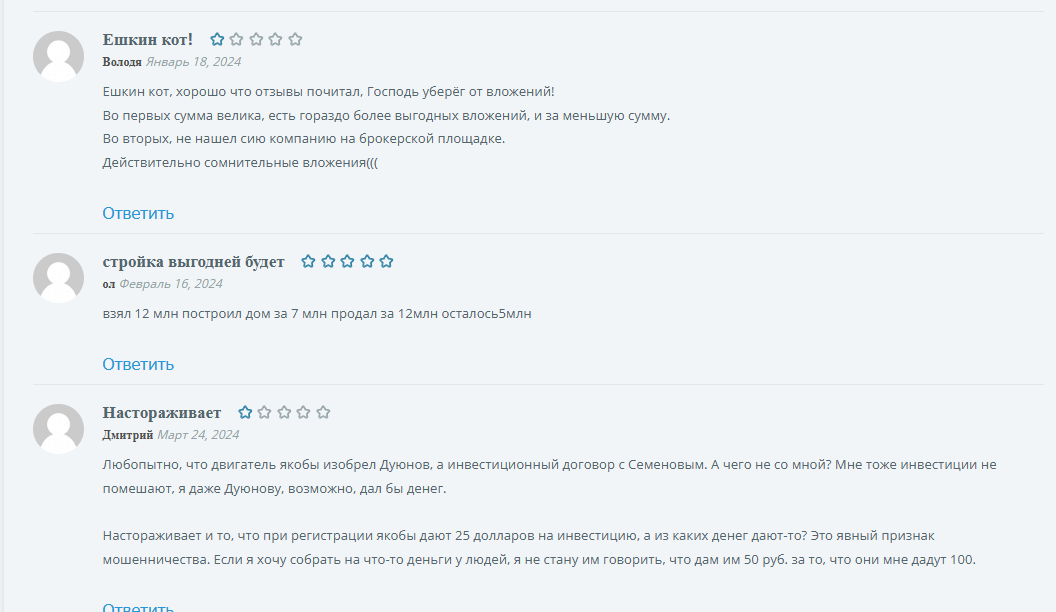 В сети можно найти немало мнений, что Дирижабли Нового Поколения использует схему пирамиды. Если отбросить самостоятельные попытки Дуюнова найти инвесторов для реализации своей идеи с 2017 года, то даже после партнерства с Solargroup прошло уже 4 года, завод в Москве планировался еще в 2019, как и покупка земли. До сих пор не выполнено ни одно обещание. Фактически конторы не существует, выхода на IPO не было и не предвидится. Доли, которые выкупают инвесторы, являются просто цифрами в личном кабинете. Их нельзя продать, обменять или каким-то другим способом вернуть вложения. В отзывах немало жалоб на потерянные деньги и время. Владельцы компании комментариев не дают.