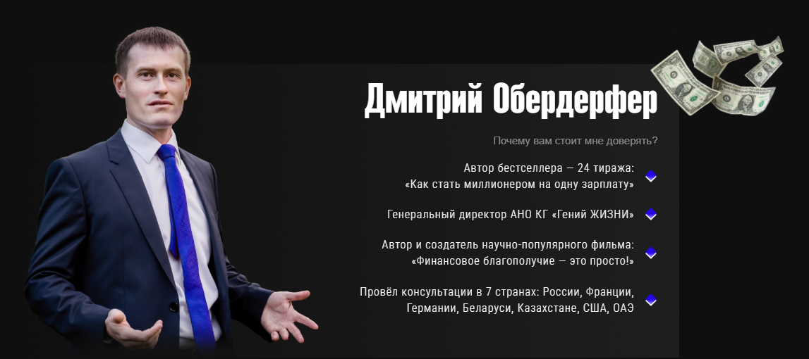 Дмитрий Обердерфер впервые появился на рынке финансового коучинга года три назад и с тех пор активно ведет несколько площадок под брендом GeniusLIFE, включая тг-канал. В основе его предложений — персональное сопровождение клиентов, инвестиционные вебинары и онлайн-курсы по управлению капиталом. Первые курсы Дмитрия обердерфера на Fnavigator.ru вызвали живой интерес у аудитории, но одновременно породили вопросы по качеству и реальной эффективности. В этом обзоре разберем ключевые аспекты работы «Обердерфер | Финансы», проанализируем его биографию и активность, а также соберем мнения пользователей.