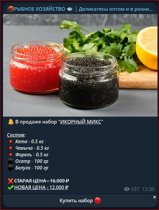 Схема покупки в описаниях выглядит просто – клиент выбирает позицию в ленте, пишет админу в личные сообщения, получает реквизиты для перевода и оплачивает заказ полностью. Минимальная сумма составляет 3000 рублей. После оплаты покупателю обещают оперативно доставить заказ в любой регион РФ.Мы не советуем доверять сомнительным телеграмм-каналам с анонимными админами. «Рыбное хозяйство» – один из них. Автор завлекает пользователей обещаниями низких цен и оперативной доставки. Все это делается лишь для того, чтобы выманить предоплату. Никакие морепродукты не доставляются. После получения денег админ перестает выходить на связь.