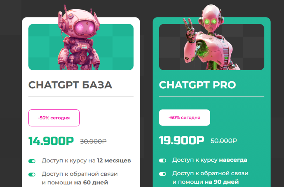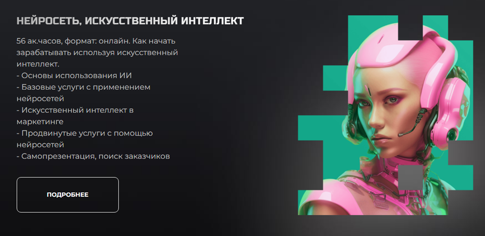 Основная программа по искусственному интеллекту состоит из 61 урока, включает 58 академических часов. По ее завершении наставник обещает, что клиенты смогут оказывать 15 услуг, используя преимущества Chat GPT, зарабатывать на этом неплохие деньги.