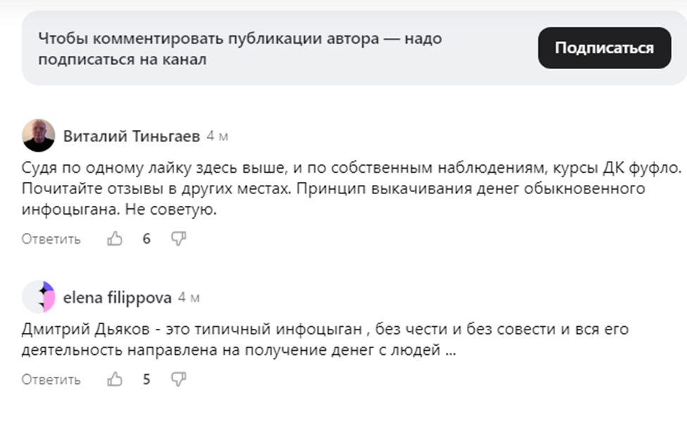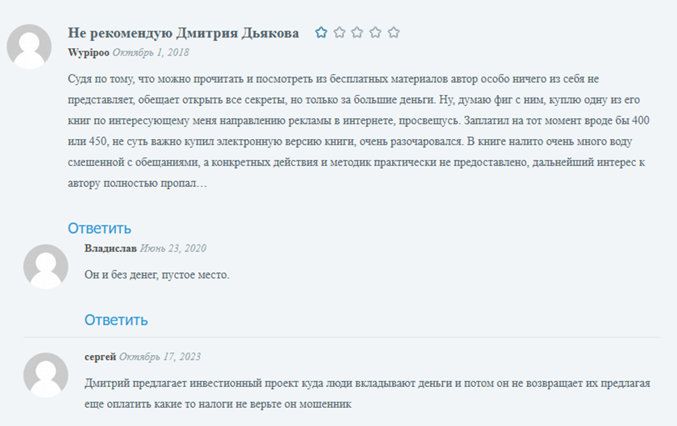 Если прочитать сторонние ресурсы, отзывы об обучении говорят, что Дмитрий Дьяков –– инфоцыган или банальный развод. Клиенты жалуются, что купились на обещания высокого заработка, которое так и не воплотилось в жизнь.