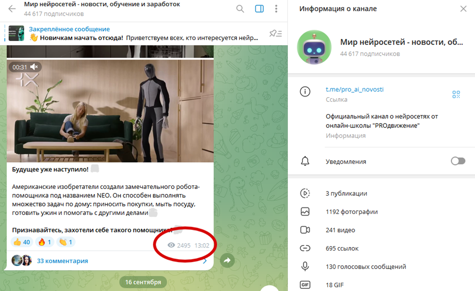 Также в Telegram действует информационный канал онлайн-школы с названием Pro Ai Novosti. Он создан в апреле 2023 года, благодаря знаниям автора в области СЕО, сумел набрать 45 тыс. подписчиков. Но если сопоставить аудиторию с количеством просмотром, станет ясно, что Дмитрий Дьяков использует не совсем корректные способы продвижения.