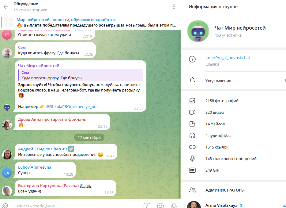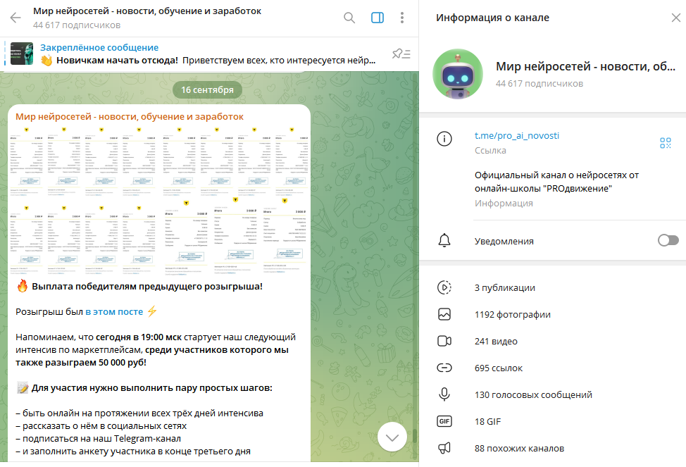 16 сентября 2024 года в телеграм-канале “Мир нейросетей — новости, обучение и заработок” были опубликованы результаты розыгрыша, проводившегося среди всех участников интенсива по маркетплейсам.