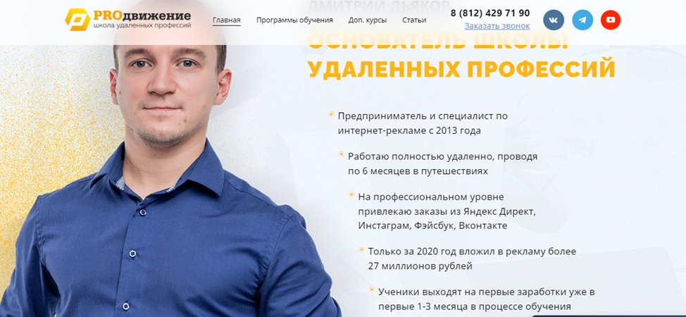 В новой редакции портала “Proдвижение” нет биографии основателя. Если поднять предыдущий вариант из архива можно узнать, что Дмитрий Дьяков является профессиональным экспертом в области интернет-рекламы, успешно работает в профессии с 2013 года. Наставник гордится, что трудится полностью удаленно, проводя по 6 месяцев в путешествиях. Нам непонятно, как Дмитрий Дьяков успевает составлять новые курсы для школы “Продвижение”, а также проверять задания, координировать учеников на первых этапах после выпуска. Последнее преимущество активно встречается в отзывах, опубликованных на некоторых сайтах.