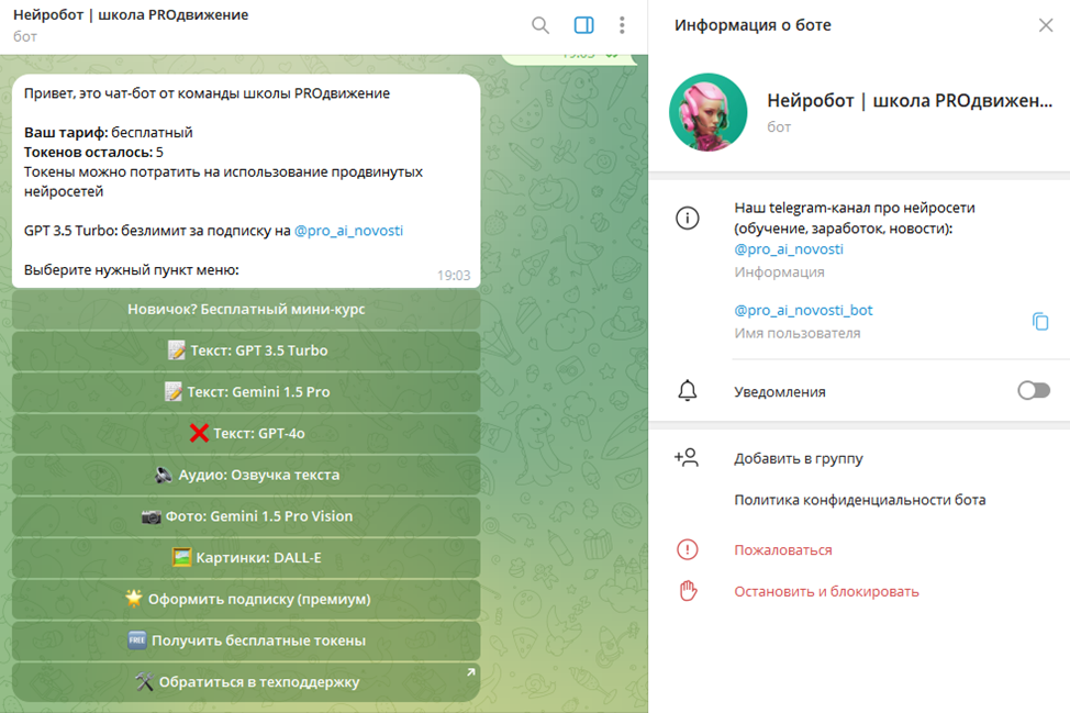 У курсов по нейросетям существует отдельный телеграмм-бот Pro Ai Novosti Bot, предлагающий несколько пробных модулей обучения. За его нормальную работу отвечает Support, доступный по адресу Pro Ai Feedback Bot.