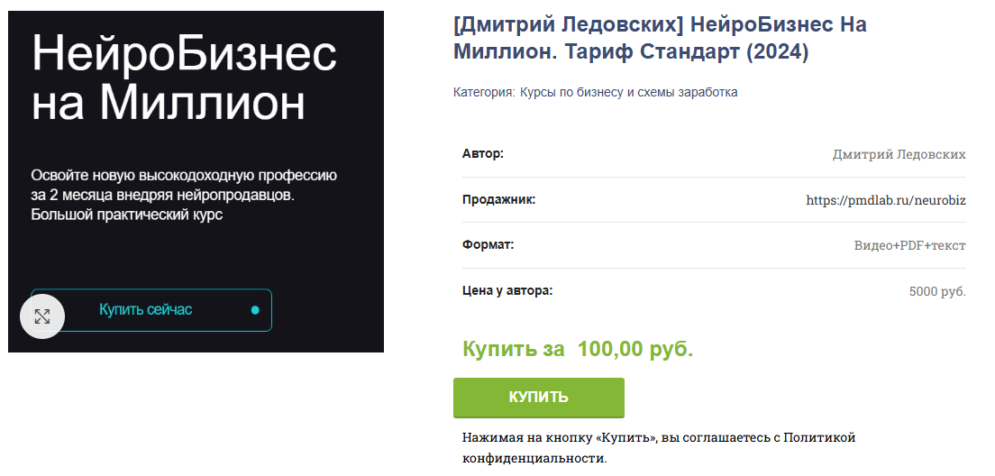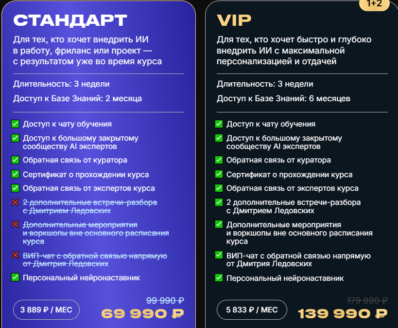 Ранее также был курс «Нейродоход» от Дмитрия Ледовских. Но сейчас фокус сместился на новую программу. Старый курс не продается на сайте. Но его можно найти в сети или купить за копейки на форумах. Это дает возможность оценить подачу материала без серьезных трат. Не известно сколько стоит тариф стандарт на курсе «Нейробизнес на миллион» от Дмитрия Ледовских.Отзывы о школе Aibasis Ru