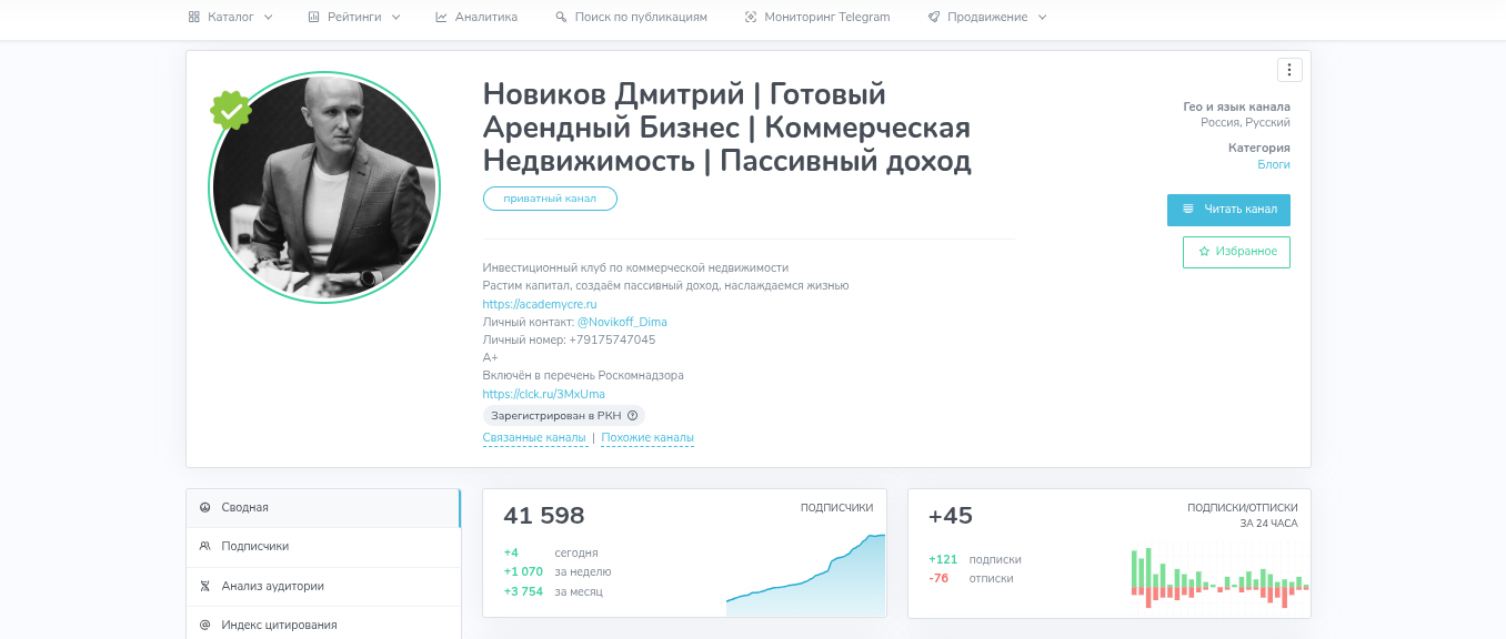 Аудитория у паблика Дмитрия большая — более 41 000 человек, но это лишь на первый взгляд. Чтобы убедиться в реальности подписчиков или накрутке, наша редакция проверила паблик инвестора через TGStat. Итак, судя по активному приросту пользователей, лектор активно закупает рекламу. Наши предположения подтвердились — индекс цитирования 374.