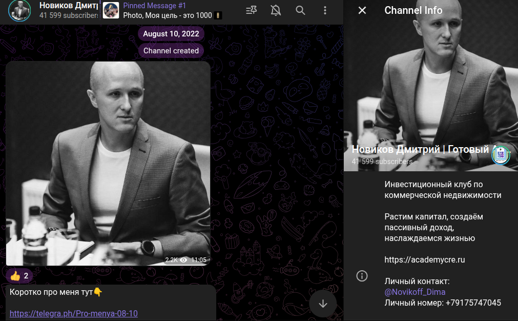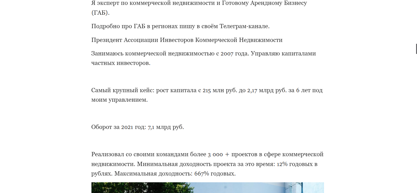 Тредов на целевой площадке «Т-Инвестиции» нет. Судя по всему, Дмитрий обходить платформы, где есть реальные эксперты, стороной, чтобы не отвечать на неудобные вопросы. Кроме сайта, инвестор Дмитрий Новиков ведет ТГ-канал «Академия ГАБ». На него подписаны свыше 41 000 человек, а старт был 10 августа 2022 году.О себе эксперт рассказал в отдельной ветке. Естественно, Дмитрий является экспертом по готовому арендному бизнесу. Кроме этого, лектор является Президент Ассоциации Инвесторов Коммерческой Недвижимости, а с 2007 года работает с коммерческой недвижимостью и управляет капиталами частных инвесторов.