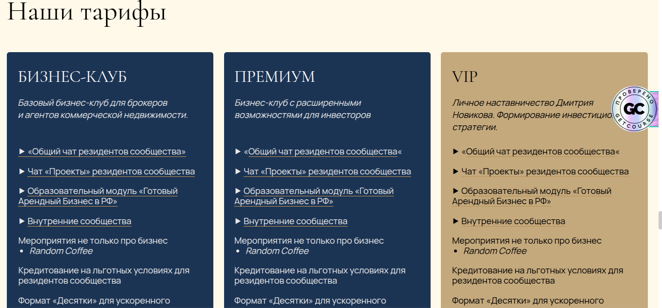 На сайте образовательной платформы автор академии готового арендного бизнеса Дмитрий Новиков предлагает разные варианты членства. Пакеты отличаются стоимостью и возможностями.