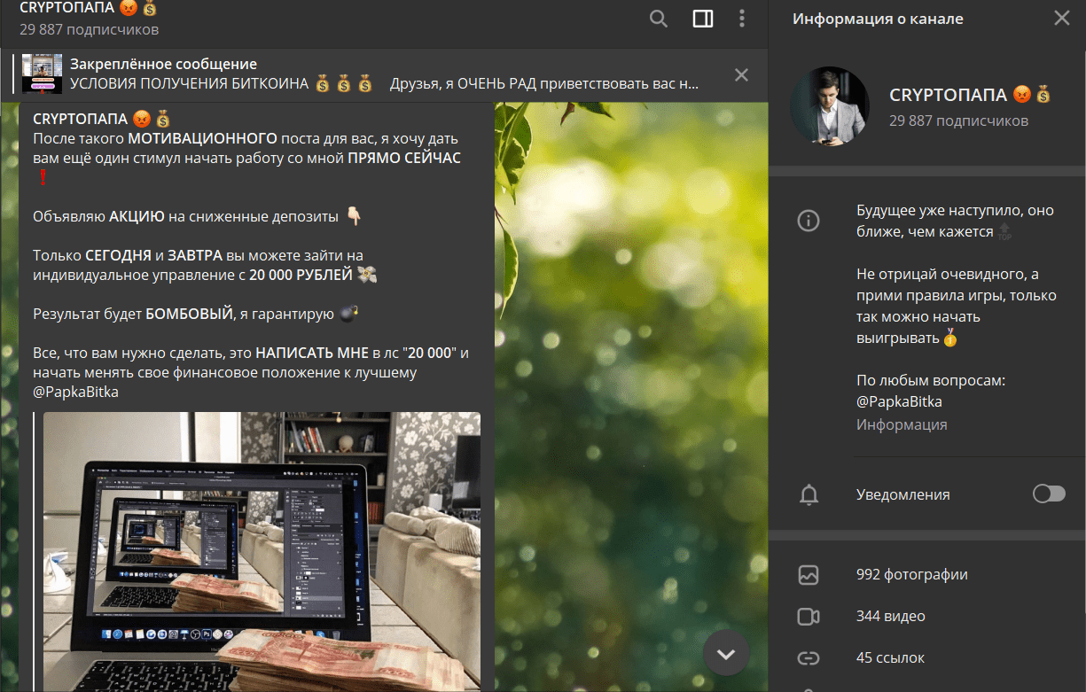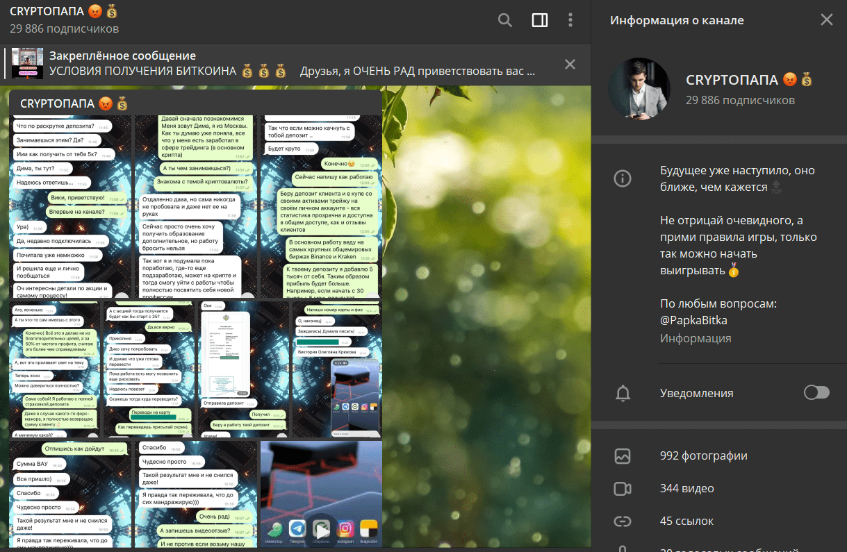 Чтобы выглядеть максимально убедительно, мошенник выкладывает ссылки на страницы несуществующих инвесторов. Это дополнительные аккаунты, созданные трейдером Дмитрием Песковым и его подельниками. На сторонних ресурсах отрицательные комментарии отсутствуют. Но это скорее всего связано с тем, что спекулянт недавно сменил название Telegram канала.