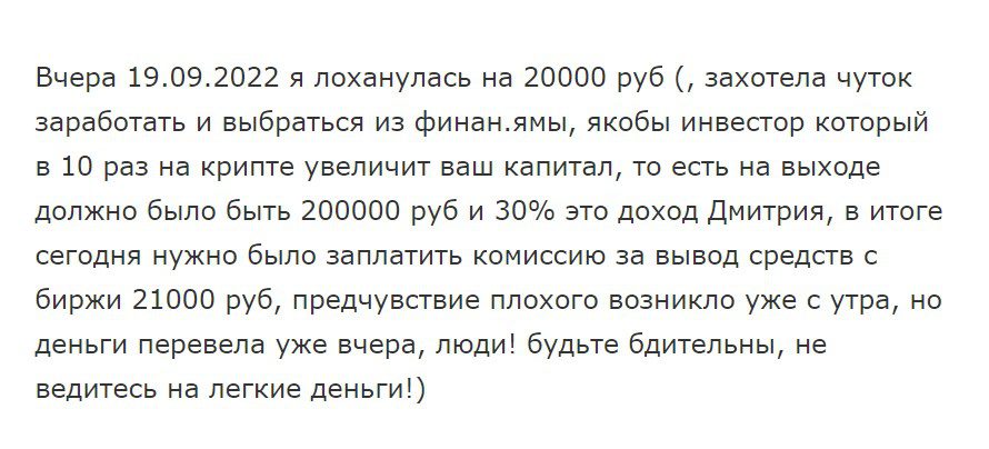 На сторонних сайта отзывы клиентов о Дмитрии Велинском отрицательные. Пользователи сообщают, что их кинули на деньги и не отдали ни выигрыш, ни первый взнос. Кроме того, мошенник пытался вытянуть с жертв как можно больше средств, требуя дополнительные взносы на уплату комиссий биржи или залога.
