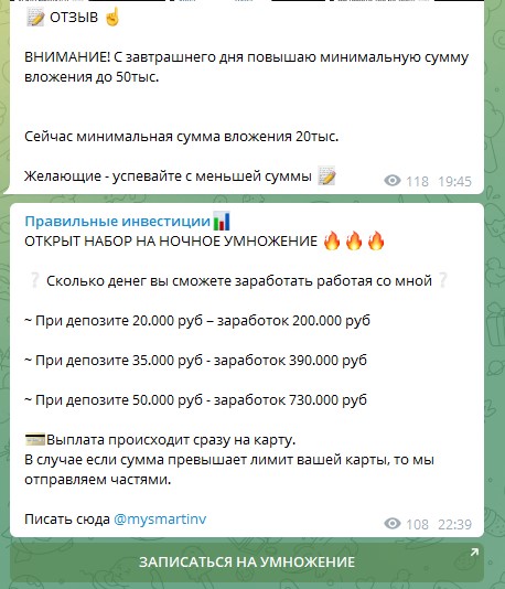 Мы нашли как минимум два аккаунта Велинского в телеграмме. Первый – @smartinv, отмеченный знаком скам. На этот профиль поступало большое количество жалоб, поэтому инвестор поспешил сделать другой профиль. Сейчас он общается с подписчиками с аккаунта @mysmartinv. Схема развода у Дмитрия Велинского осталась та же.Клиентам предлагают поучаствовать в раскрутке депозита. Набор объявляют ежедневно, минимальная сумма вклада повысилась до 50 000 рублей с 29 сентября. Вернуть обещают 730 000 р. О том, откуда именно появится такая сумма денег, Велинский не распространяется. Статистики сделок на канале нет, никаких документов трейдер тоже не предоставляет.