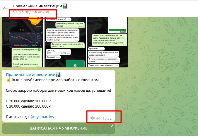 Канал Велинского в Telegram можно найти по адресу https://t.me/kinoshkar, называется он «Правильные инвестиции». Сейчас на канале 59 923 подписчиков. Статистика явно накручена и большинство участников – боты. Это можно понять по малому количеству просмотров записей и низкой активности подписчиков.