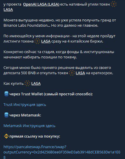 Через несколько месяцев после запуска канала Антипов резко заинтересовался искусственным интеллектом. Постоянно вспоминал его в своих постах, рассказывал о перспективах этих технологий. «Внезапно» нашел криптовалюту, которая должна была выиграть от ажиотажа вокруг ИИ и подорожать во много раз.Это была неизвестная монета OpenAI LASA, которая, по словам Антипова, получила инвестиции от Бинанс и готовила к выпуску децентрализованный искусственный интеллект. Антипов из своих источников получил информацию о готовящемся листинге LASA и закупке этого актива криптовалютными фондами. Призывал подписчиков быстрее начинать ее закупку.