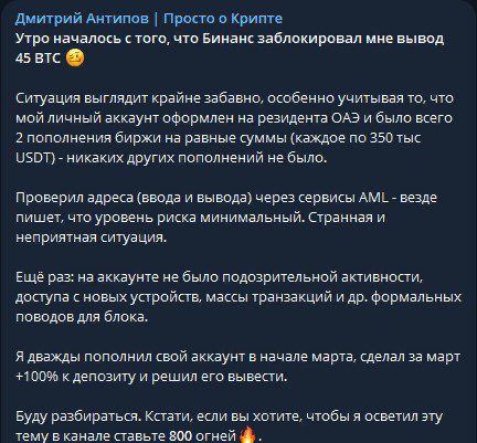 Свое сообщество назвал Дмитрий Антипов | Просто о крипте, за 3 месяца работы собрал на нем 16 500 человек. Судя по просмотрам постов, аудитория сильно накручена ботами. В середине мая канал уже удален, а трейдер исчез.