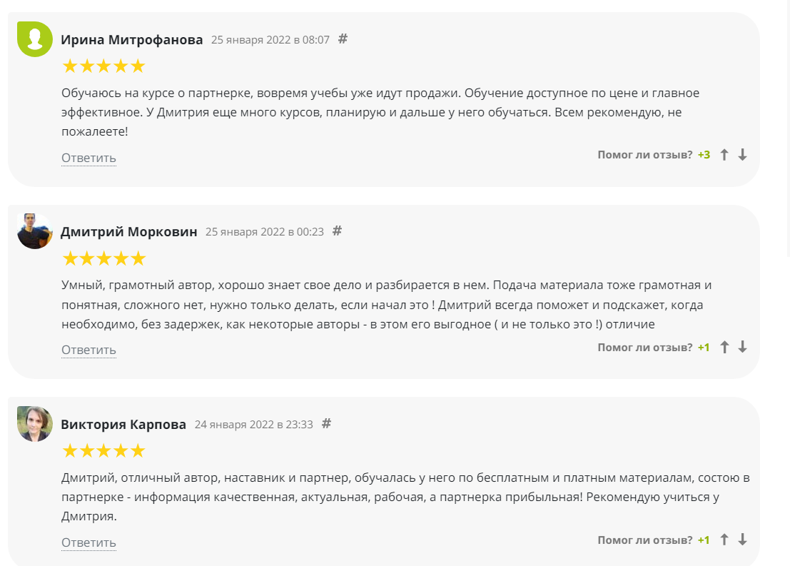 На независимых площадках мы нашли высказывания о том, что основатель курсов качественно подает материалы и помогает ученикам разобраться с темами. Кроме того, юзеры отмечают актуальную информацию.