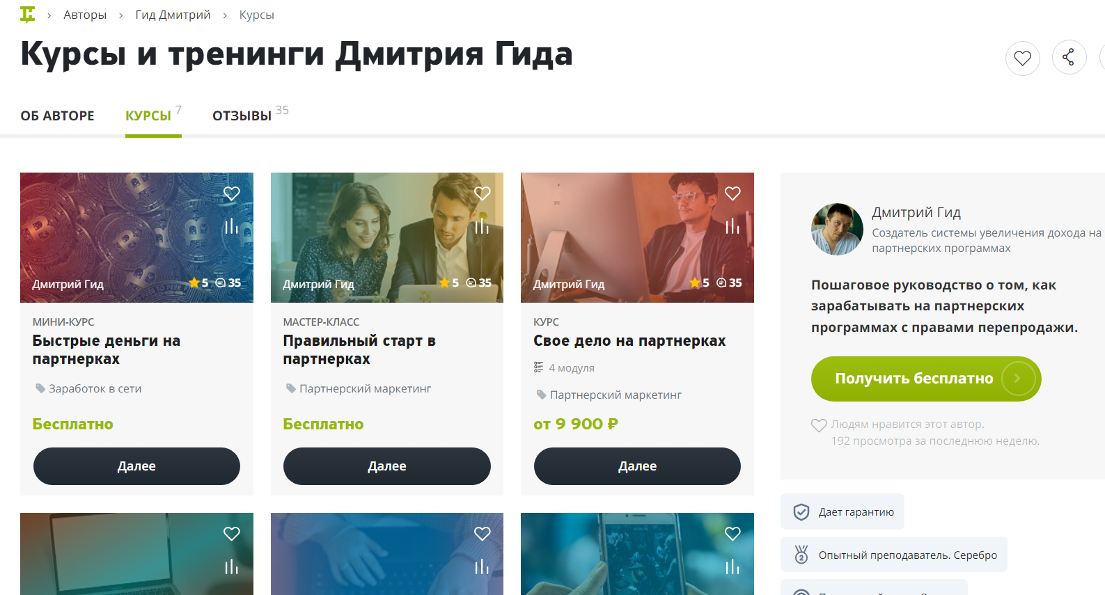 Из бесплатных материалов Дмитрий Гид продвигает “Старт в партнерках”, “Быстрые деньги” и другие. У автора курсов есть собственный сайт dimagrid ru.