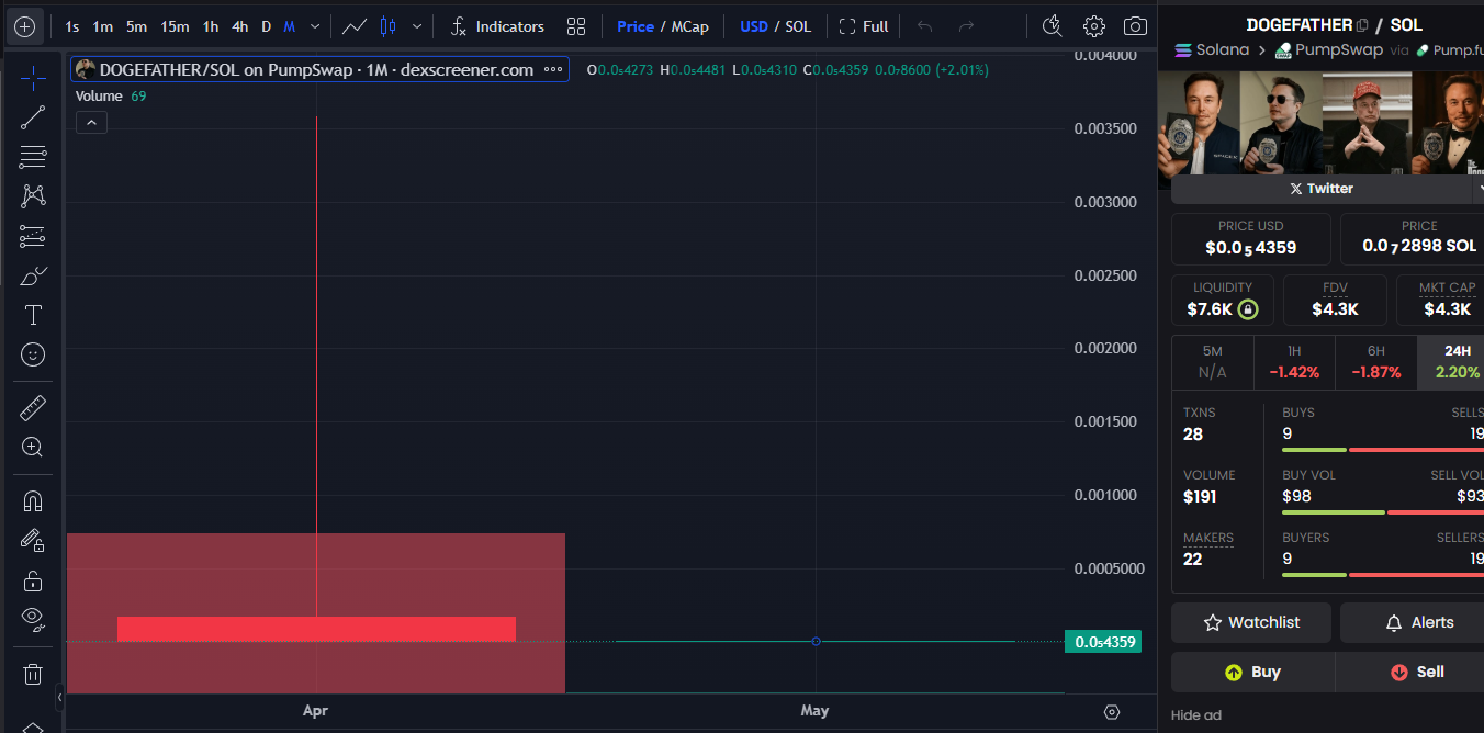 Авторы не раскрывают информации о токеномике проекта. Непонятно какой объем от общей эмиссии они оставили для себя, какой процент монет используется для маркетинга, а какой – ушел на обеспечение ликвидности и торговлю. Тем не менее, судя по всему, в мае 2025 года это не имеет вообще никакого значения. Токен практически никому не интересен. Общий торговый объем DOGEFATHER coin – менее 200 баксов в сутки. При этом торги ведутся очень вяло. В них участвует около 20 селлеров и 10 байеров: