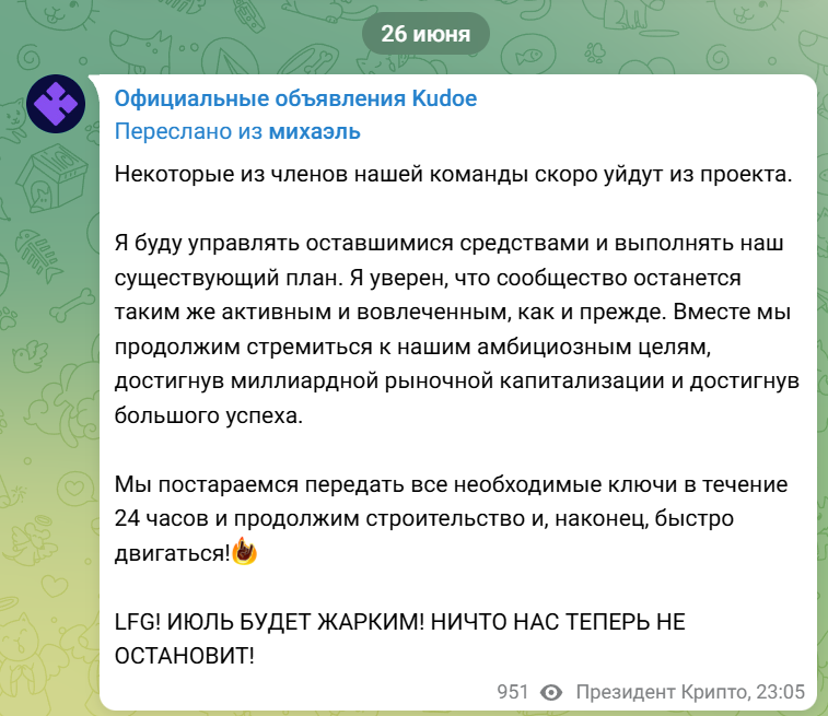 На официальном тг-канале написано, что теперь управляющей командой разработчиков проекта является сообщество Kudoe io.