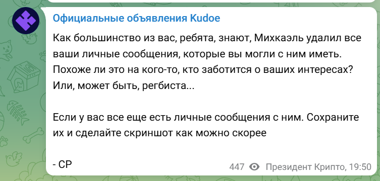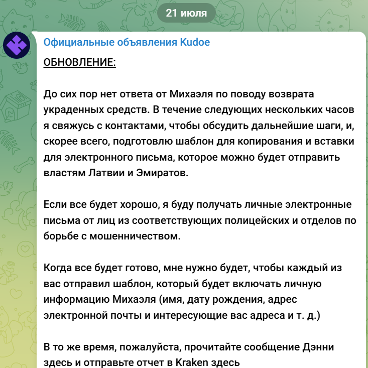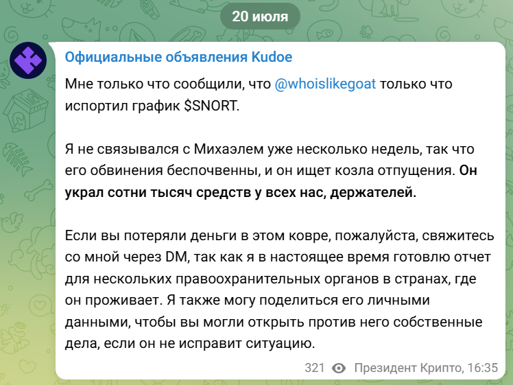 Из обрывочных сообщений Президента сообщества-разработчиков Kudoe, опубликованных последний раз в июле 2024 года, становится понятно, что член команды Михаэль украл денежные средства держателей, скрылся и началось его уголовное преследование.