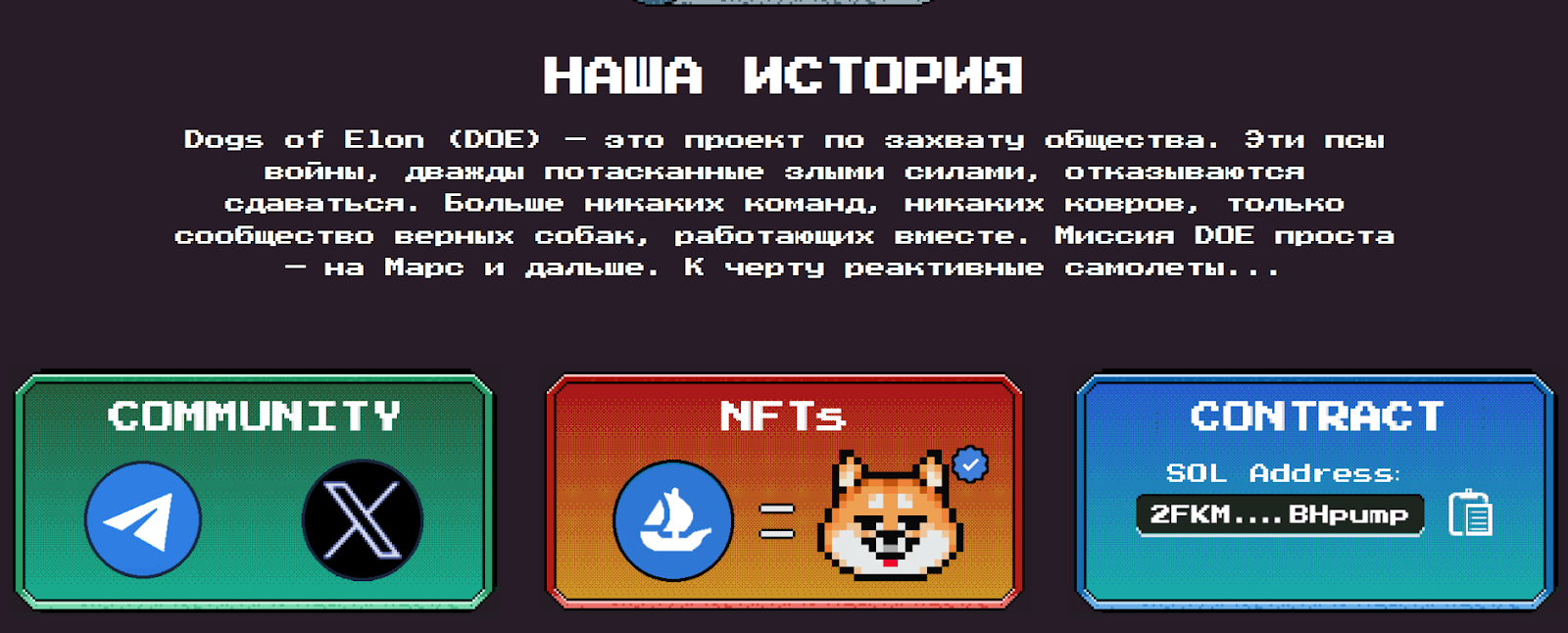На сайте Dogsofelon Io представлена миссия проекта, которая заключается в том, чтобы токену Doe достичь в своем росте Марса.