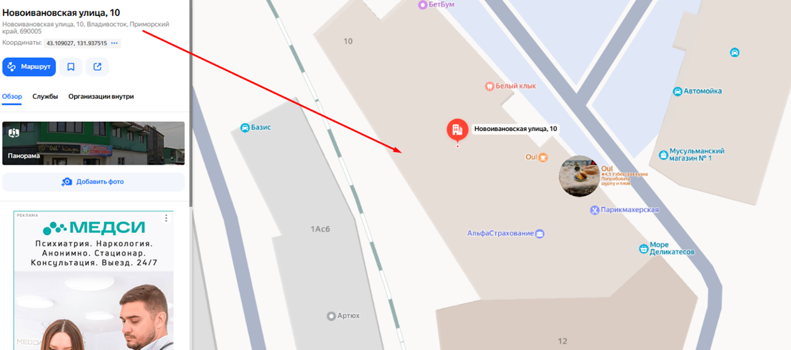 Проверка показывает, что на картах Яндекс и Гугл такой магазин по указанным координатам не найден. Есть небольшое двухэтажное здание, где помещения сдаются в аренду, но компания Дом Дисков среди арендаторов не числится.