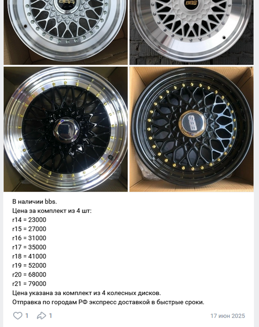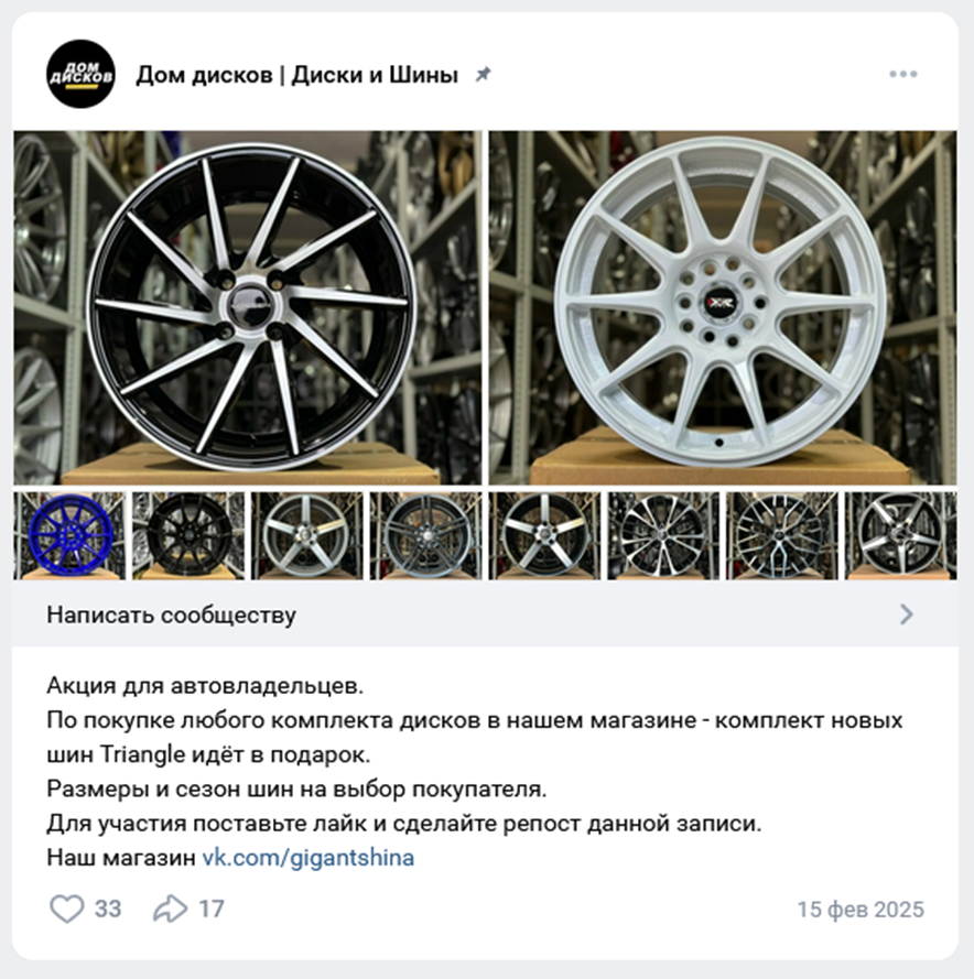 Периодически потенциальным покупателям предлагают акции. Например, комплект резины при покупке автодисков. Заказчик может сам выбрать типоразмер и сезонность покрышек. Условия участия простые – отметить публикацию и сделать репост.