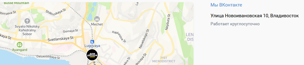 В группе Вконтакте и на страницах каталога нет никакой информации о компании с названием Дом Дисков. Отсутствуют сведения о регистрации, разрешении на торговую деятельность. Ничего не сказано о владельце бизнеса и менеджерах. Есть только адрес во Владивостоке – ул. Новоивановская, 10. В описании к компании сказано, что есть филиал в Южно-Сахалинске, но его адрес отсутствует.