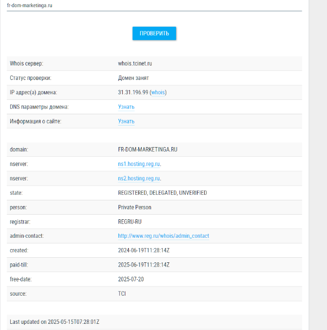Домен сайта зарегистрировали в июне 2024 года, апгрейд сайта делали в мае 2025 года. Все данные о регистраторе сайта скрыты.