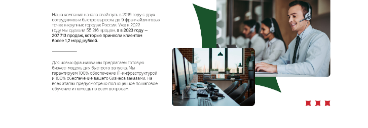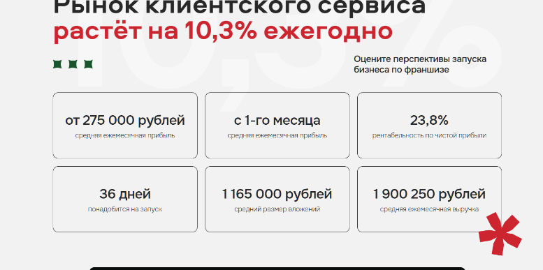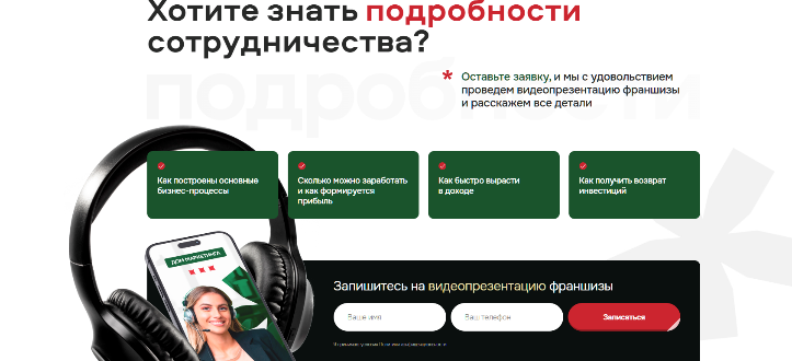 На сайте франшизы много общих слов и минимум конкретики. Все подробности обещают озвучить при личной беседе. Такой подход вызывает сомнение в надежности проекта.
