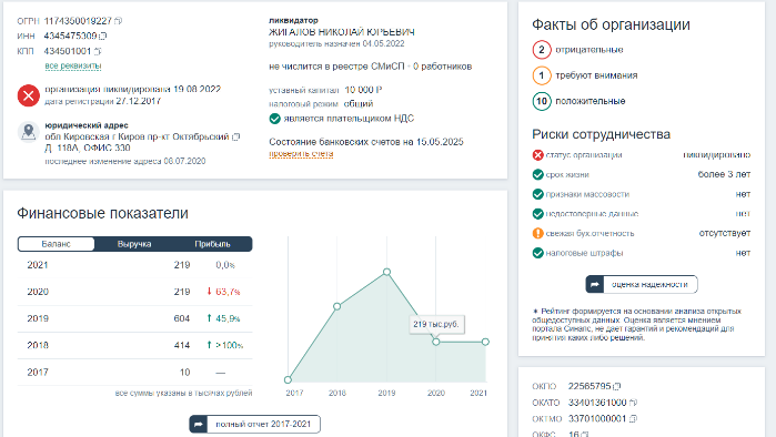 Найдена одна официально зарегистрированная фирма ООО «Дом маркетинга». Компания находится в городе Киров, количество сотрудников организации 1 человек. Компания не ликвидирована, но не ведет финансовую деятельность с 2022 года.